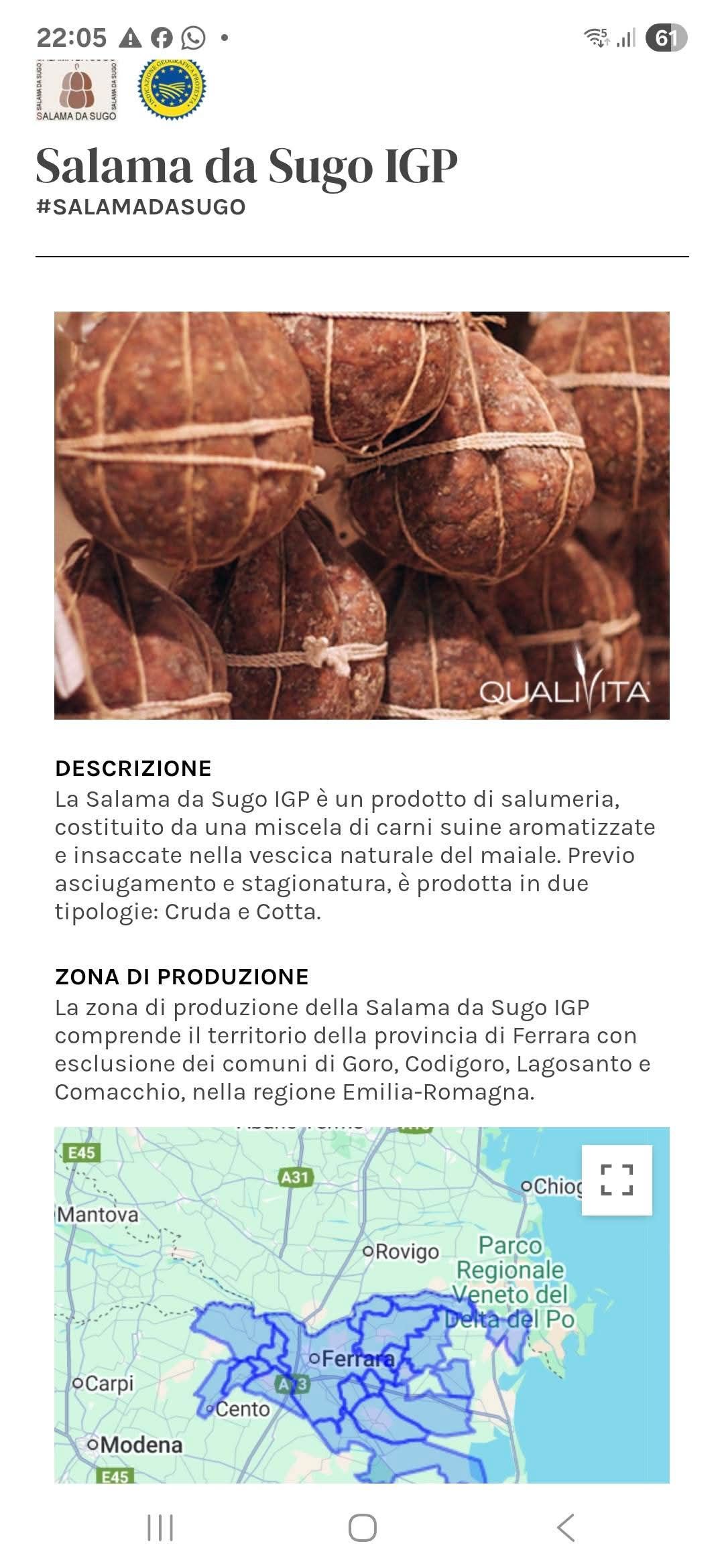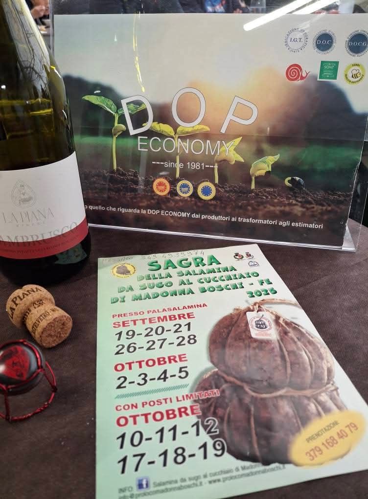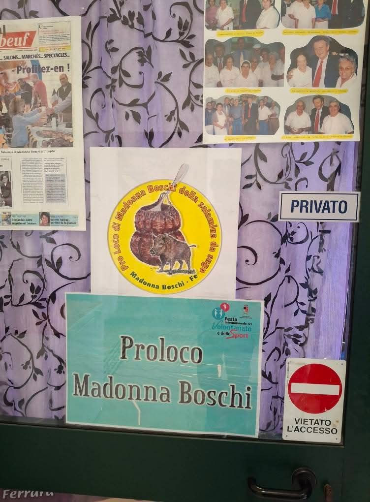 Cosa succede quando incontri in una domenica uggiosa di Ottobre , nel basso Mantovano , un tuo cliente ingegnere meccanico ( uno che monta turbine gigantesche nelle centrali elettriche )che non sapeva cosa fare per passare un po ' il tempo e dopo aver finito insieme ai collaboratori ,di servire la prima colazione a tutti gli altri ospiti ? Ma si , si va alla scoperta di una prodotto sconosciuto al grande pubblico , lo inseguivo da un po ' e proprio quella mattina c'era la sagra che ne celebrava la bontà , detto fatto direzione Madonna Boschi in provincia di Ferrara , poco a nord della bellissima citta' degli Estensi , accoglienza magnifica , ci hanno fatto imbucare nonostante le prenotazioni chiuse da tempo , abbiamo avuto il piacere di assaggiare quella non certificata in attesa di vedere la differenza con quella I.G.P. in quanto essendo domenica l 'unica azienda che la produce era ovviamente chiusa , ma ci riandremo perche' DOP ECONOMY , non si perde d'animo , sapore molto sapido , ma piacevole , il mio ospite ha molto gradito , la ragazza con la sua enorme gentilezza e' stata preziosissima ,compreso il presidente , insomma anche questo " A VISTA D'OCCHIO " ha colto nel segno! Da oggi oltre al cotechino e allo zampone sapremo che esiste un parente molto stretto che e' riuscito ad avere la I.G.P. .... LA SALAMA DA SUGO ! Il tutto accompagnato dalla COPPIA FERRARESE non IGP e LAMBRUSCO DI CASTELVETRO.