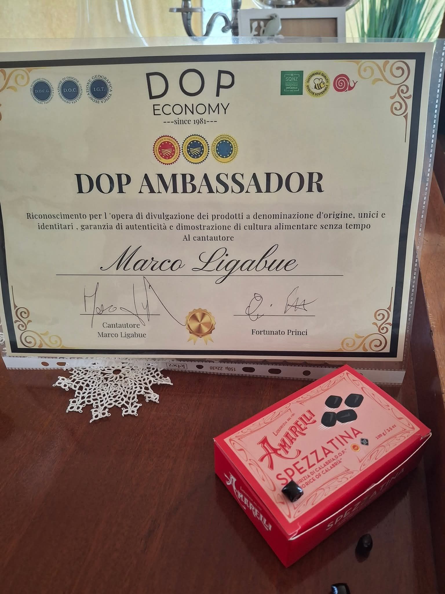 Perché il titolo di DOP AMBASSADOR a Marco ? Perché e' Ambasciatore dell 44 DOP e IGP della regione Emilia Romagna che contribuisce a divulgare nel mondo anche attraverso la sua arte musicale , nel contempo io ho contribuito a far conoscere 4 delle 21DOP e IGP calabresi .